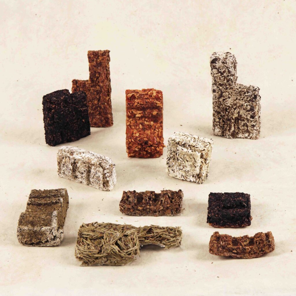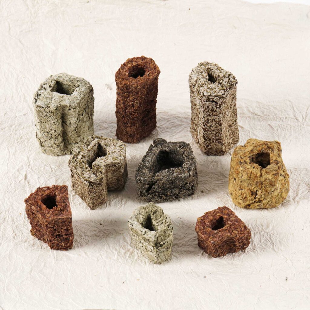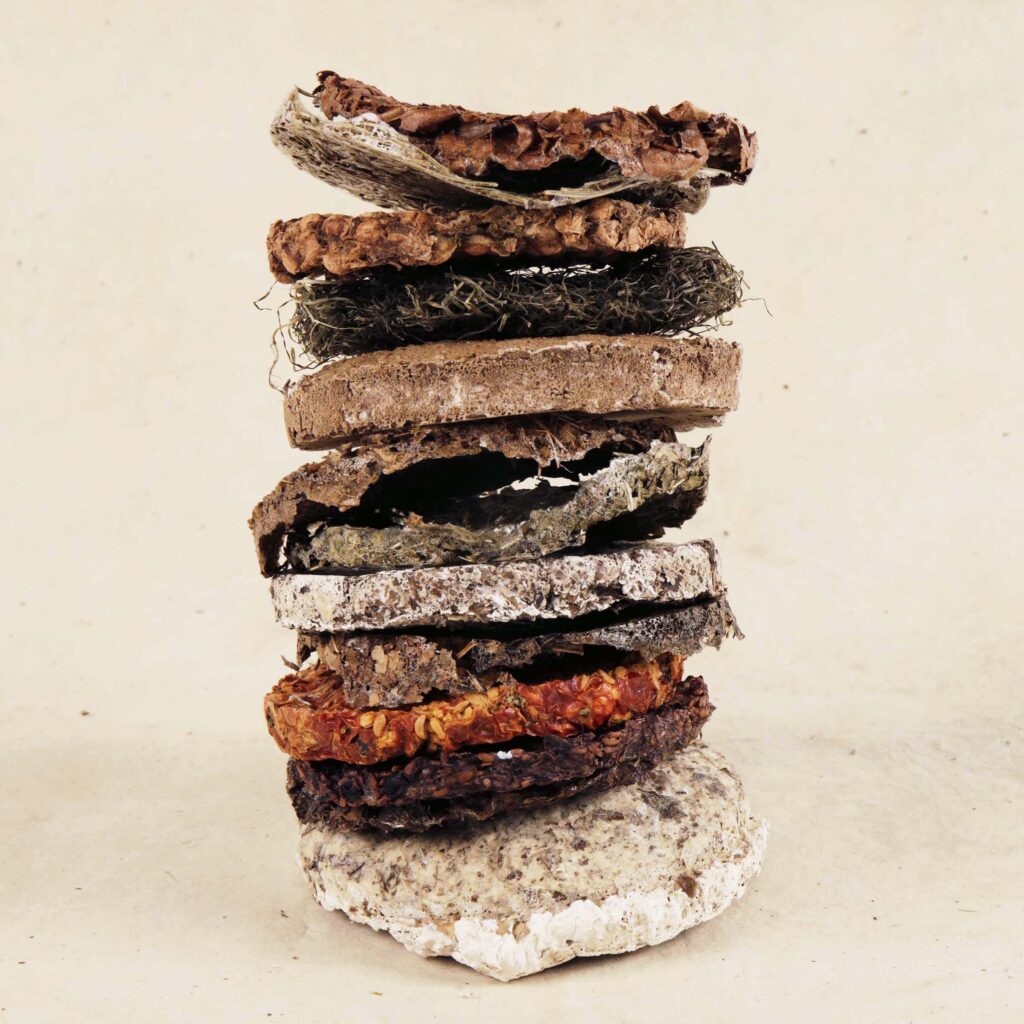 Fibreboards and vessels moulded using left-over plant matter from the Lliw Lleol (Local Colour) natural dye database, 2020.